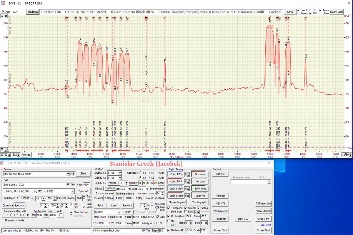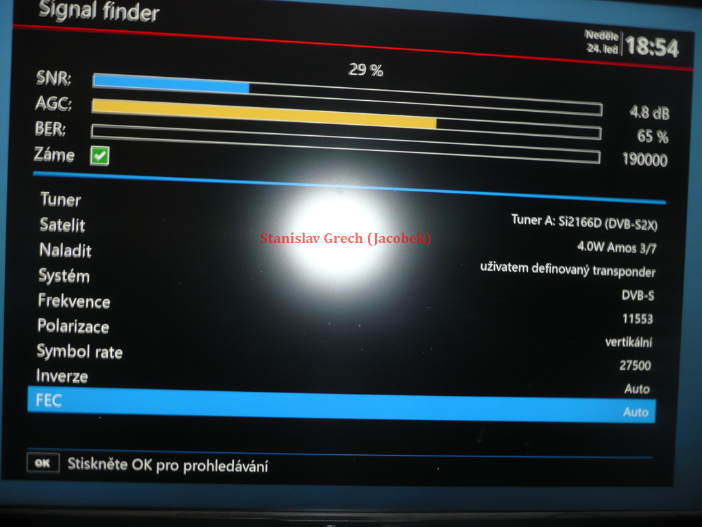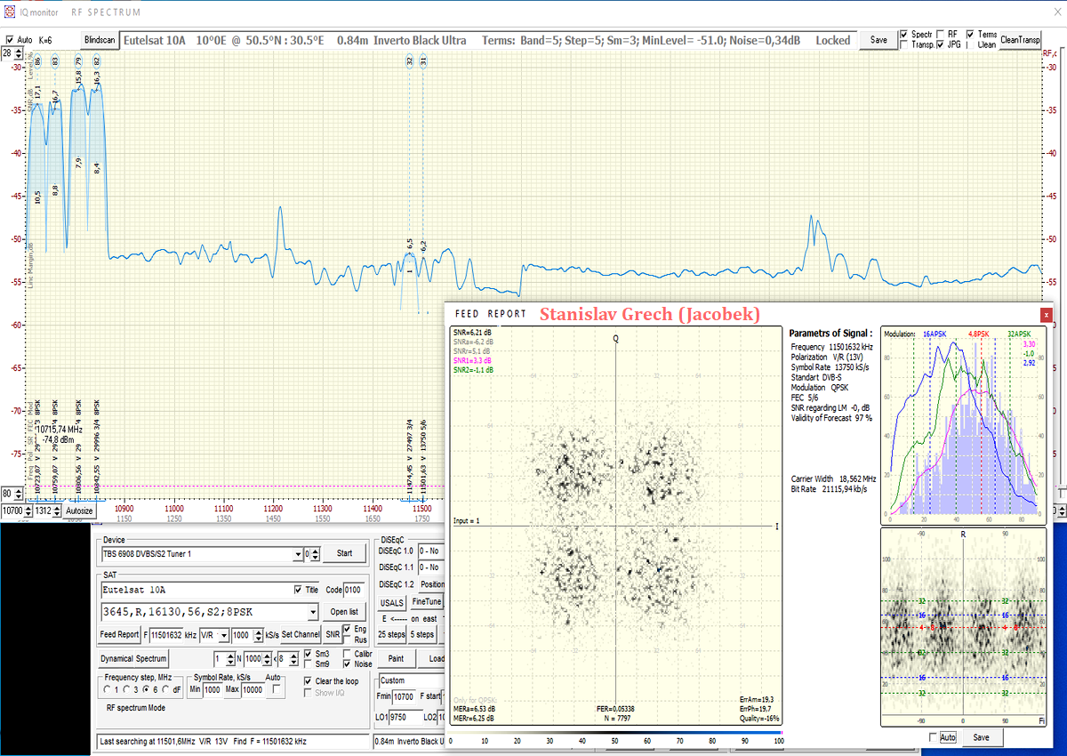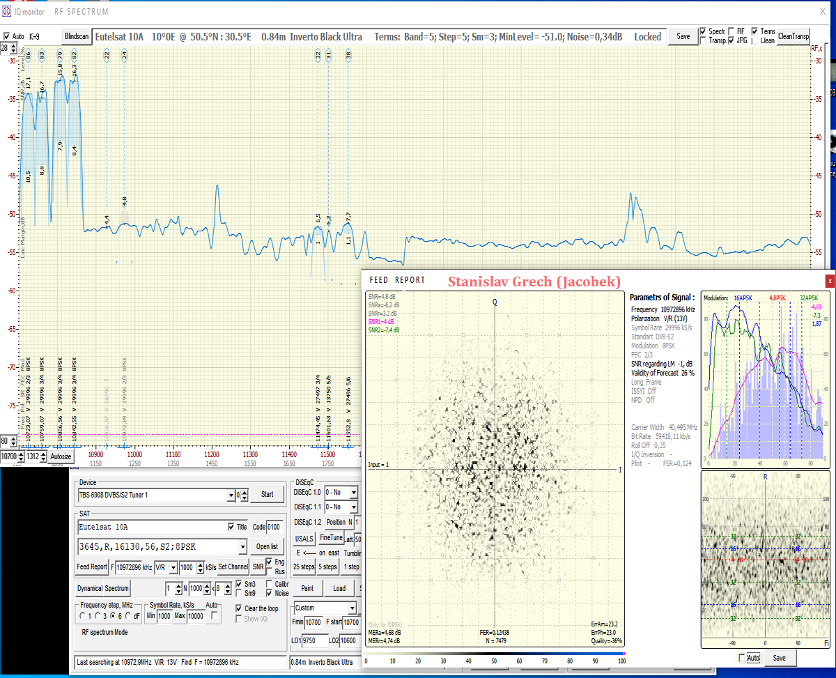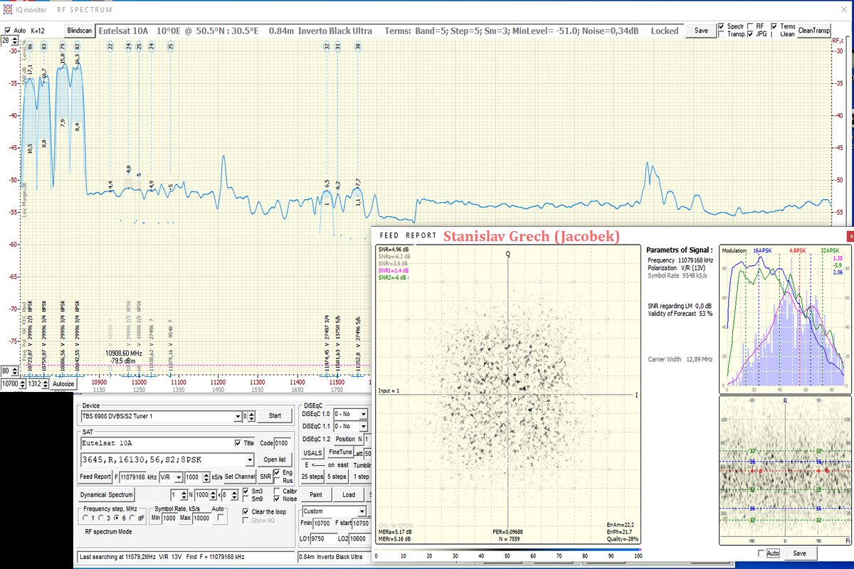 ►1, Všetky výsledky tu prezentovaného satelitného príjmu z družíc AMOS 3/7 sú odvodené od priemeru reflektora paraboly Prodelin D=370 cm.