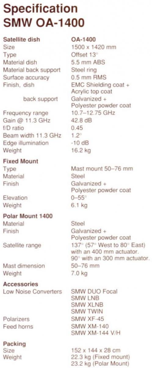 Vlastním ofsetovou anténu SMW s označením 1400 JUMBO,osazenou táhlovým motorem Black Jack,polarizátorem Hirschmann CSP 1210 E,konvertorem
