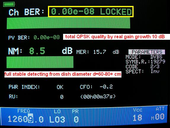 -ak hladinu uzamknutia QPSK nosnej okolo MER=7 dB pomenujem detekčný medzistav bez reálne prítomnej ziskovej hladiny resp. zálohy , potom okamžitý akostný stav v Q/MPEG-2 analýze vyjadruje reálny ziskový rast resp. zálohu pred rozpadom obrazu okolo 4 dB , čo v praxi znamená pri miernej oscilácii Q/MER amplitúdy v pásme rozkmitu +/- 0,2 dB stabilný stav príjmu aj pri mierne zhoršených poveternostných podmienkach .