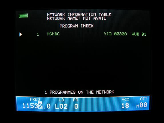 V kmitočtovom spektre TP 14 H satelitu Telstar 12 z orbitálnej pozície 15,0°W som identifikoval na f=11 532 MHz originálne americké vysielanie MSNBC TV,pri ktorom okamžitá akosť vyjadrená v MER=11,1 dB a Ch BER 3.86-04 vyjadruje plnú stabilitu príjmu s PF 365 cm .